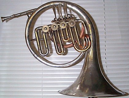 Sometimes the best thing to happen to a mellophone is to take it out of circulation and make something else out of it. In this example, the bell and branch were taken from a Boston Eb Mellophone and combined with the valves and leadpipe from a Conn single F horn. Valve slides are shortened to appropriate lengths and a fourth, stopping valve is added. An extra creative touch is the twist in the third slide crook. The result is a very useable and compact descant horn. |